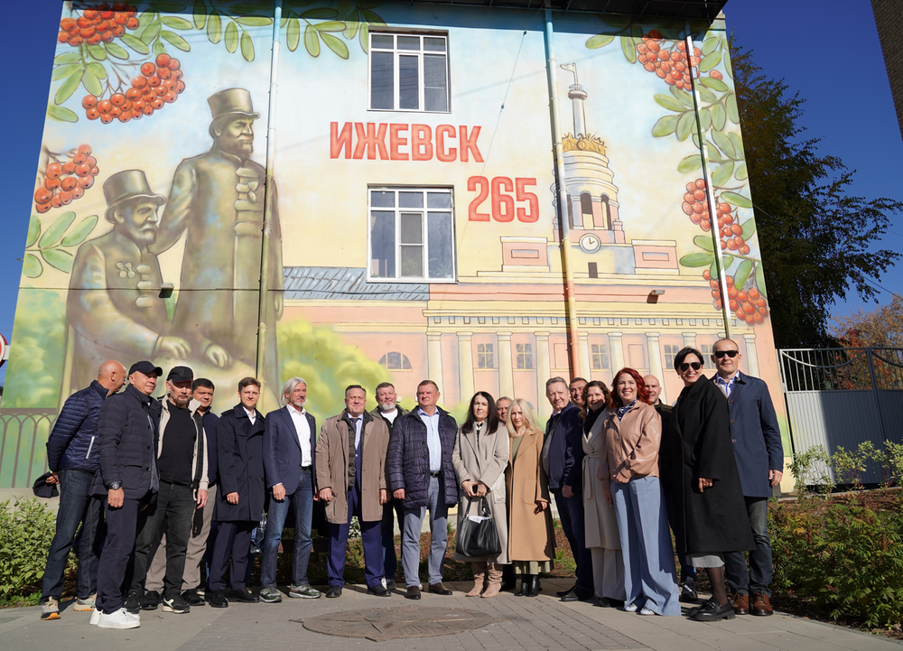 Сквер предпринимателей стал еще одним подарком городу в честь его 265-летия. Ранее на перекрестке фасад одного из домов украсил мурал с изображением ижевских оружейников.