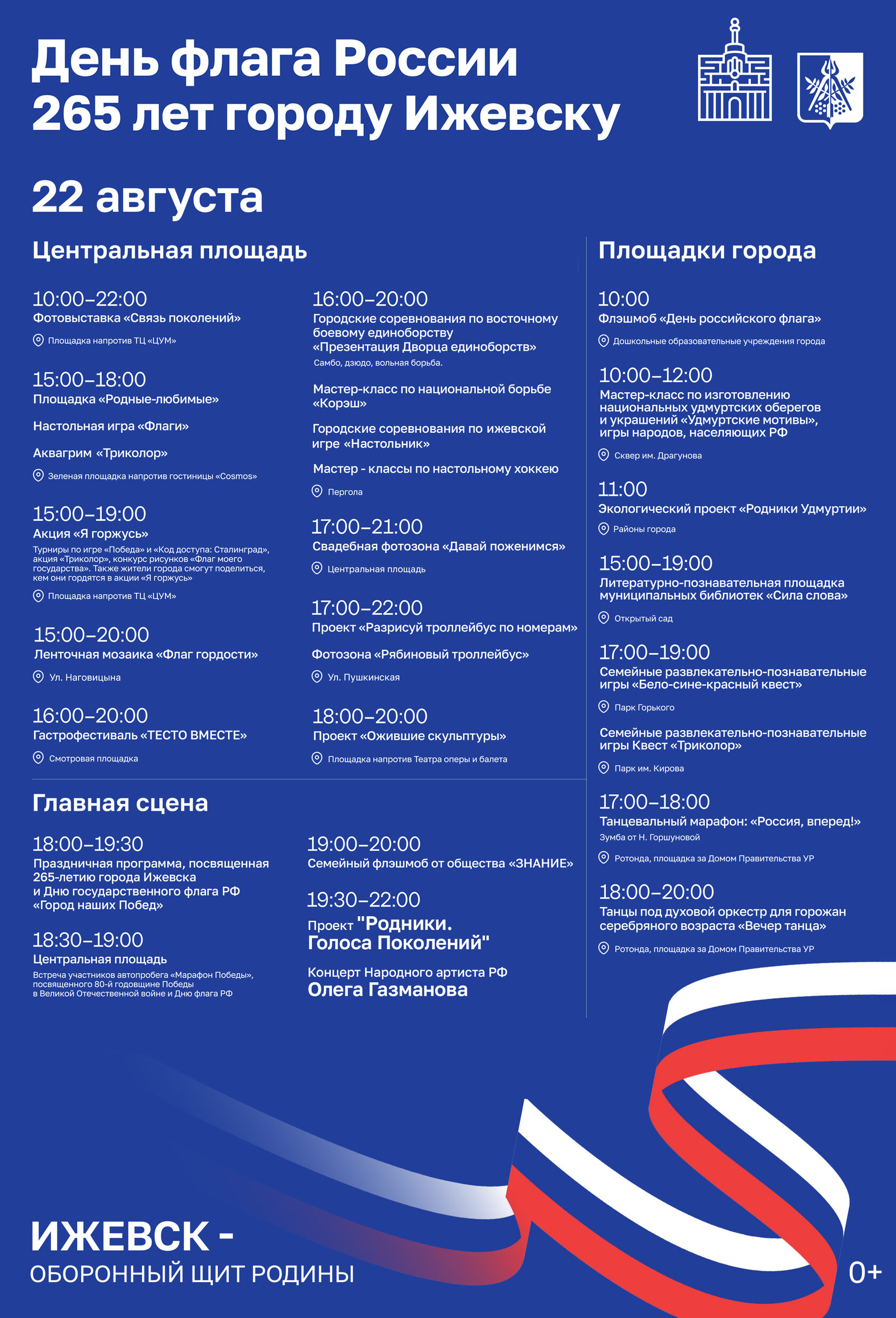Кульминацией праздника станет большая музыкальная программа «Родники. Голоса поколений» с участием народного артиста России Олега Газманова и финалистов его Всероссийского проекта «Родники». Первый такой концерт прошел в День Победы на Поклонной горе в Москве, а 22 августа его повторят в Ижевске. В этом артистам проекта помогут наши местные таланты: вокалисты и танцоры Удмуртии споют на одной сцене со звездами «Родников».